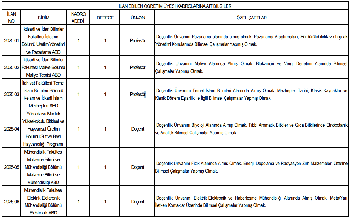 Hakkari Üniversitesi’nin yayımladığı ilanda, çok sayıda fakülte ve meslek yüksekokulunda farklı uzmanlık alanlarını kapsayan kadrolar yer aldı. Özellikle İktisadi ve İdari Bilimler, Mühendislik, Eğitim, İlahiyat, Sağlık Bilimleri ve Meslek Yüksekokulları için açılan kadrolar dikkat çekiyor.