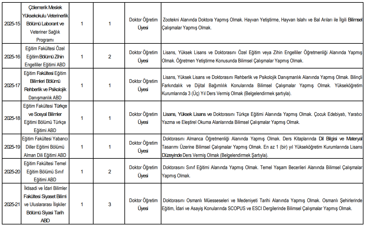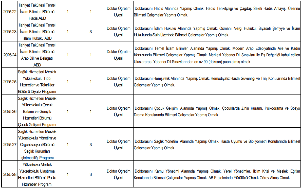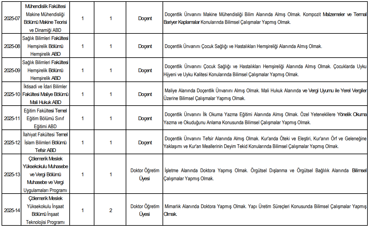 Adaylardan, ilan edilen alanlarda özgün, güncel ve uluslararası indekslerde yayımlanmış bilimsel çalışmalar yapmış olmaları bekleniyor.