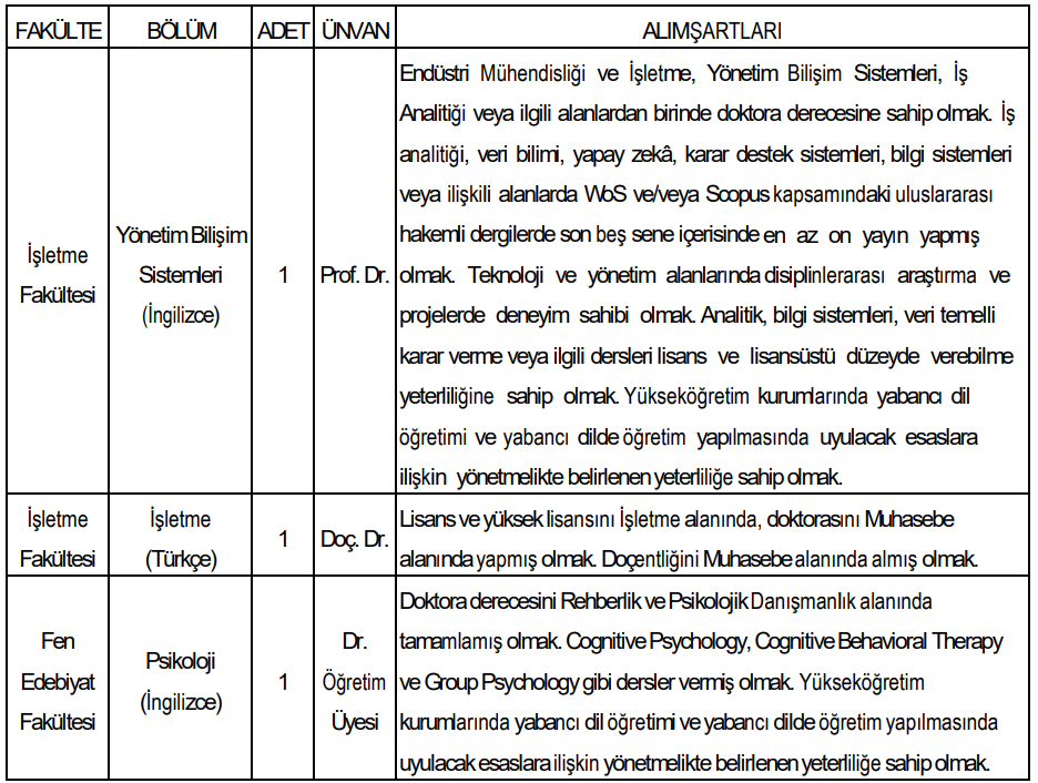 İşletme Fakültesi bünyesindeki Yönetim Bilişim Sistemleri (İngilizce) bölümüne alınacak Profesör kadrosu için oldukça kapsamlı şartlar belirlendi.