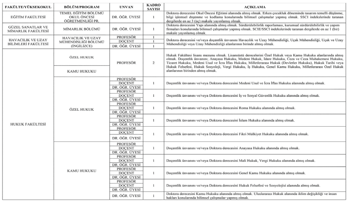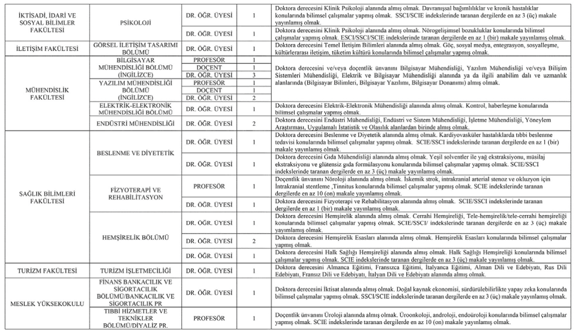Doçent ve doktor öğretim üyesi kadrolarına başvuranların ise doçentlik belgelerini dosyalarına eklemeleri şart koşuldu.
