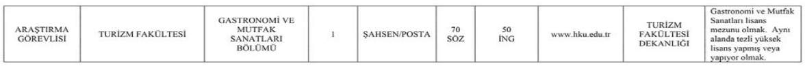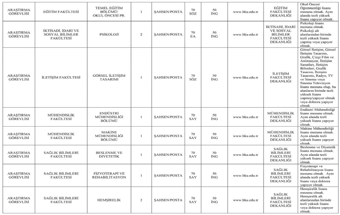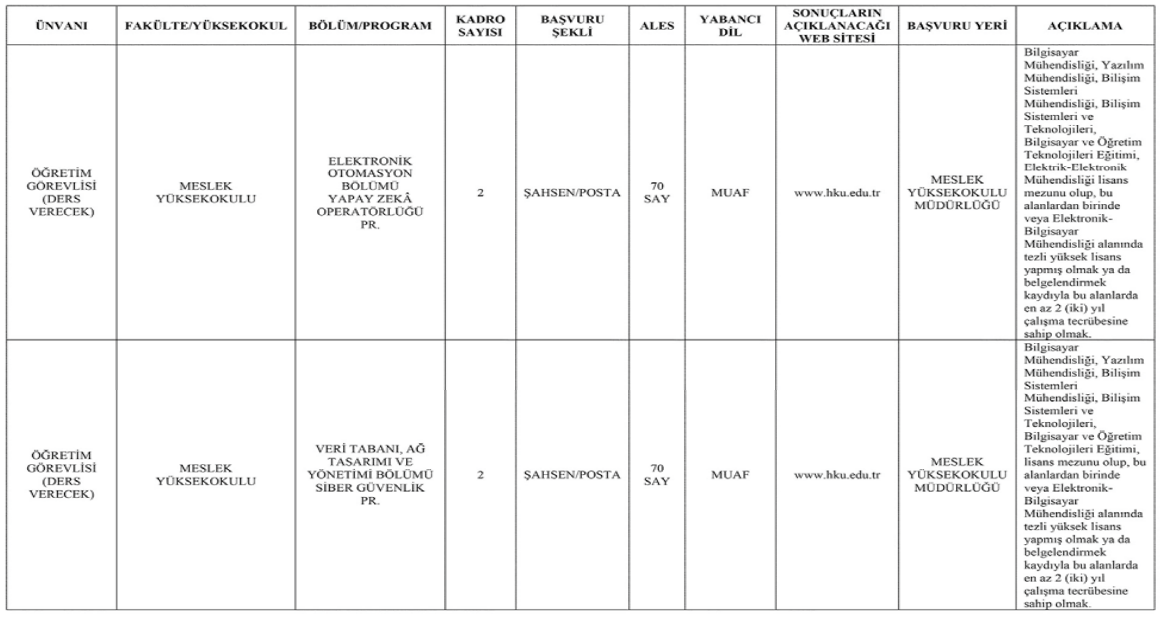 Başvurular, profesör ve doçentlik için HKÜ Personel Müdürlüğü’ne, doktor öğretim üyesi kadroları içinse ilgili fakülte dekanlıklarına şahsen veya posta yoluyla yapılacak.