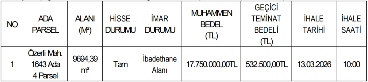 Satışa konu olan taşınmaz, Özerli Mahallesi 1643 Ada 4 Parsel’de yer alıyor. Toplam 9.694,39 m² büyüklüğündeki parselin tamamı satış kapsamında bulunuyor. İmar planında “ibadethane alanı” olarak belirtilen taşınmaz, yatırımcılar ve ilgili kurumlar açısından dikkat çekici özellikler taşıyor.