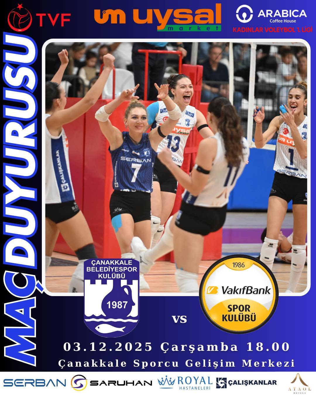 Türkiye Voleybol Federasyonu (TVF) Arabica Coffee House Kadınlar 1. Ligi’nde heyecan 11. hafta karşılaşmalarıyla devam ediyor. Ligde önemli mücadelelerden biri ise Çanakkale’de oynanacak. VakıfBank ile Çanakkale Belediyespor, 3 Aralık 2025 Çarşamba günü saat 18.00’de Sporcu Gelişim Merkezi Salonu’nda karşı karşıya gelecek. Mücadeleyi voleybolseverler ücretsiz olarak takip edebilecek.