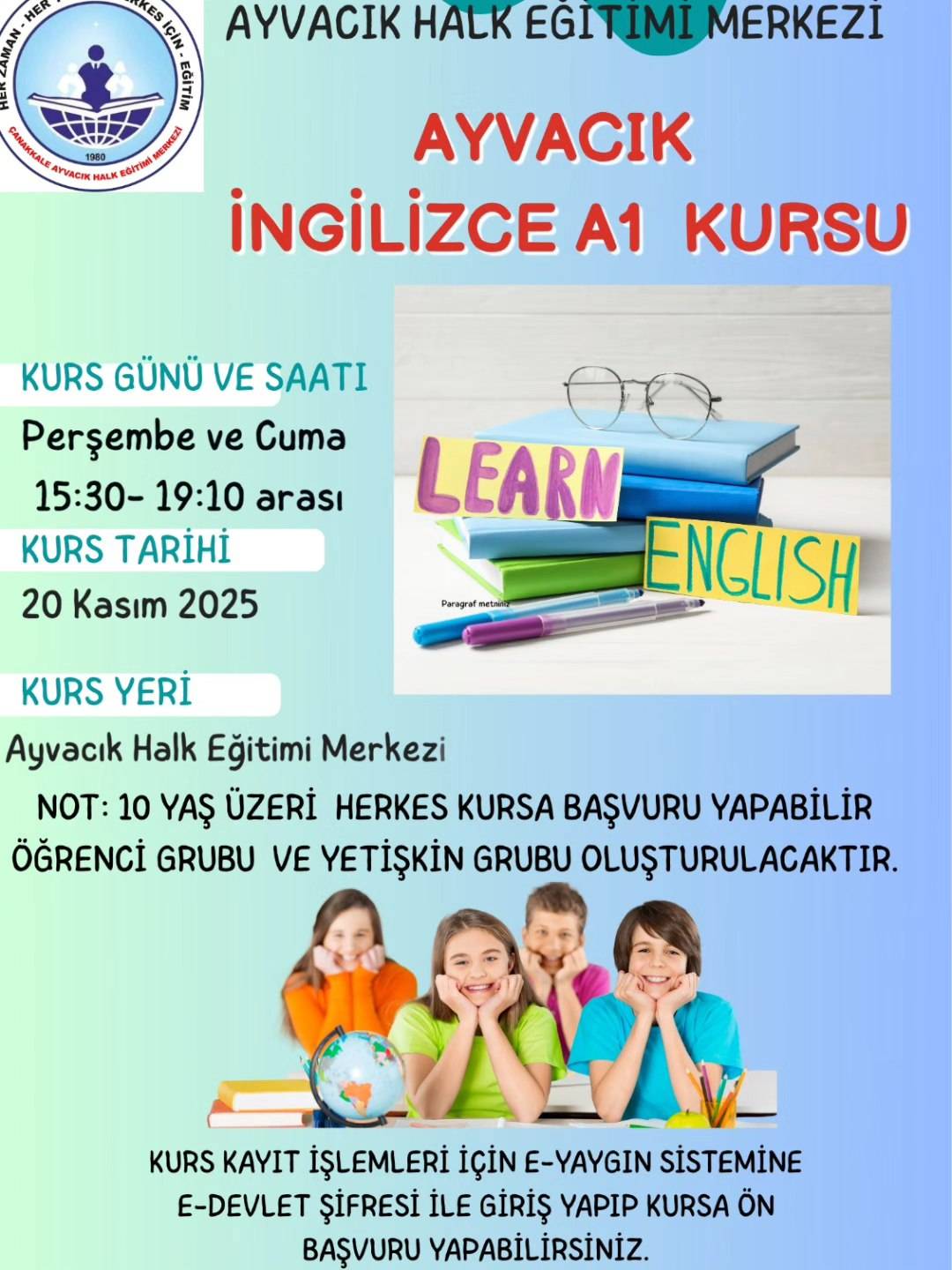 Ayvacık Halk Eğitimi Merkezi tarafından düzenlenen İngilizce A1 seviyesi kursu, 20 Kasım 2025 tarihinde başlıyor. Kurs, haftada iki gün Perşembe ve Cuma günleri, 15:30-19:10 saatleri arasında gerçekleştirilecek.