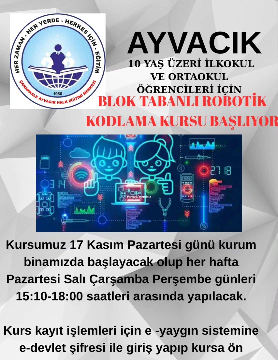 Çanakkale’nin Ayvacık ilçesinde faaliyet gösteren Ayvacık Halk Eğitimi Merkezi, her yaştan bireye hitap eden yeni kurslarını duyurdu. Merkez, İngilizce A1 ve Blok Tabanlı Robotik Kodlama kurslarıyla hem çocuklara hem de yetişkinlere öğrenme imkânı sunuyor. “Her zaman, her yerde, herkes için eğitim” mottosuyla faaliyet gösteren merkez, Kasım ayında başlayacak kurslara büyük ilgi bekliyor.