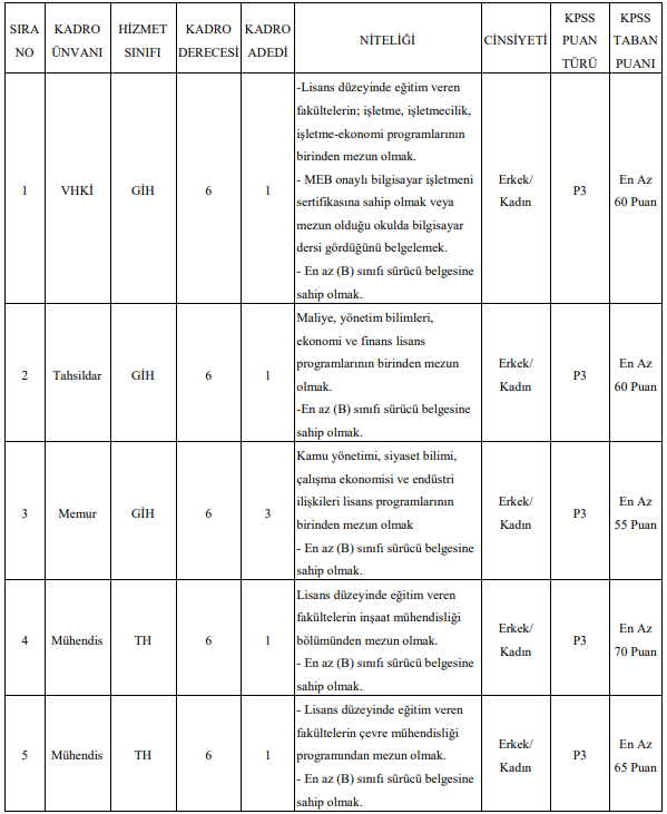Devrek Belediyesi’nin açıkladığı memur alımı ilanında toplam 7 kadro için alım yapılacak. Alım yapılacak unvanlar, nitelikler ve KPSS taban puanları şu şekilde açıklandı: