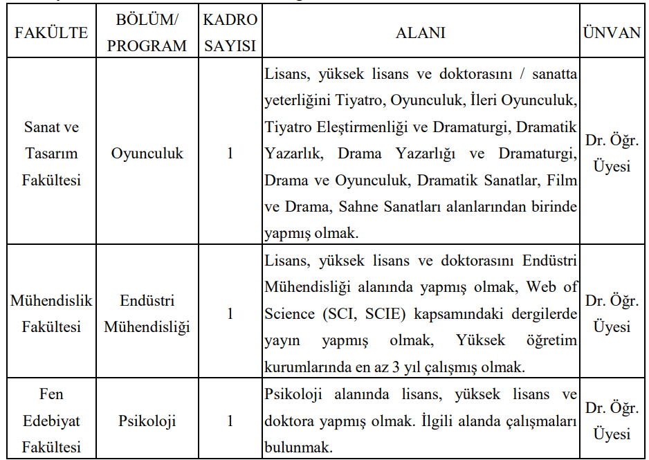 Öğretim üyesi alımları; Sanat ve Tasarım Fakültesi, Mühendislik Fakültesi ve Fen-Edebiyat Fakültesi bünyesindeki bölümlerde gerçekleştirilecek. Adayların başvurularını YÖK formatlı özgeçmiş, diploma belgeleri, bilimsel çalışmalarını içeren 4 adet flash bellek veya CD, vesikalık fotoğraf ve başvuru dilekçesi ile birlikte ilgili fakülte dekanlıklarına teslim etmeleri gerekiyor.