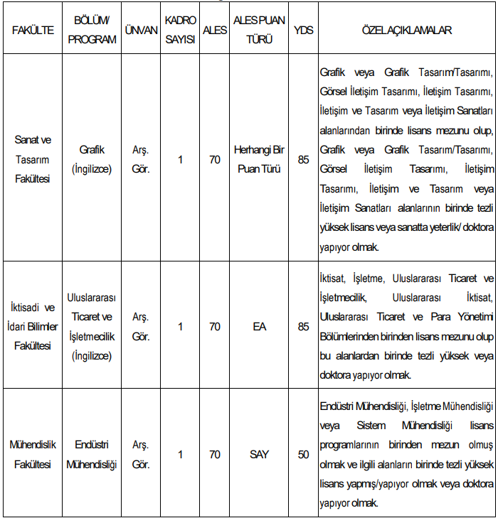 Doğuş Üniversitesi ayrıca farklı fakültelerde araştırma görevlisi alımı da yapacak. Başvuru için adayların aşağıdaki koşulları taşıması gerekiyor: