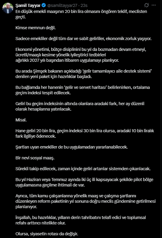 Eski AK Parti Milletvekili Şamil Tayyar, sosyal medya hesabından yaptığı açıklamada, en düşük emekli maaşının 20 bin liraya çıkarılmasını öngören teklifin Türkiye Büyük Millet Meclisi’nden geçtiğini duyurdu. Tayyar’ın açıklaması, özellikle milyonlarca emekli ve dar gelirli vatandaş tarafından yakından takip edilirken, kararın ekonomik etkileri ve uygulama detayları da kamuoyunda tartışılmaya başlandı.