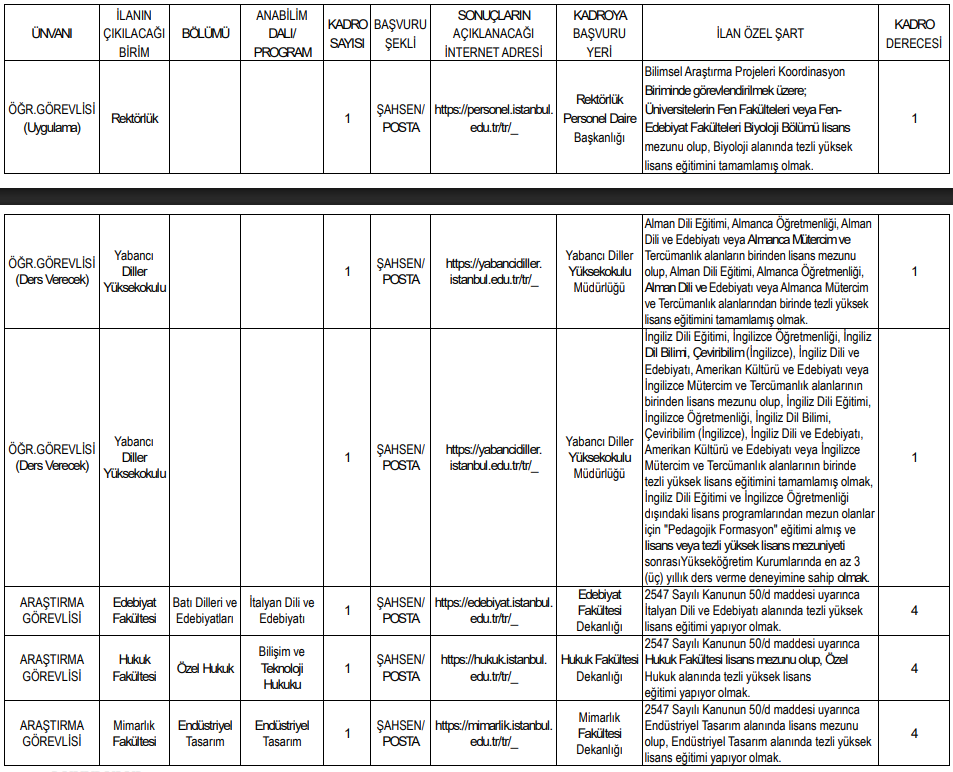 İstanbul Üniversitesi’nin ilan ettiği kadrolar ve başvuru koşulları şöyle: