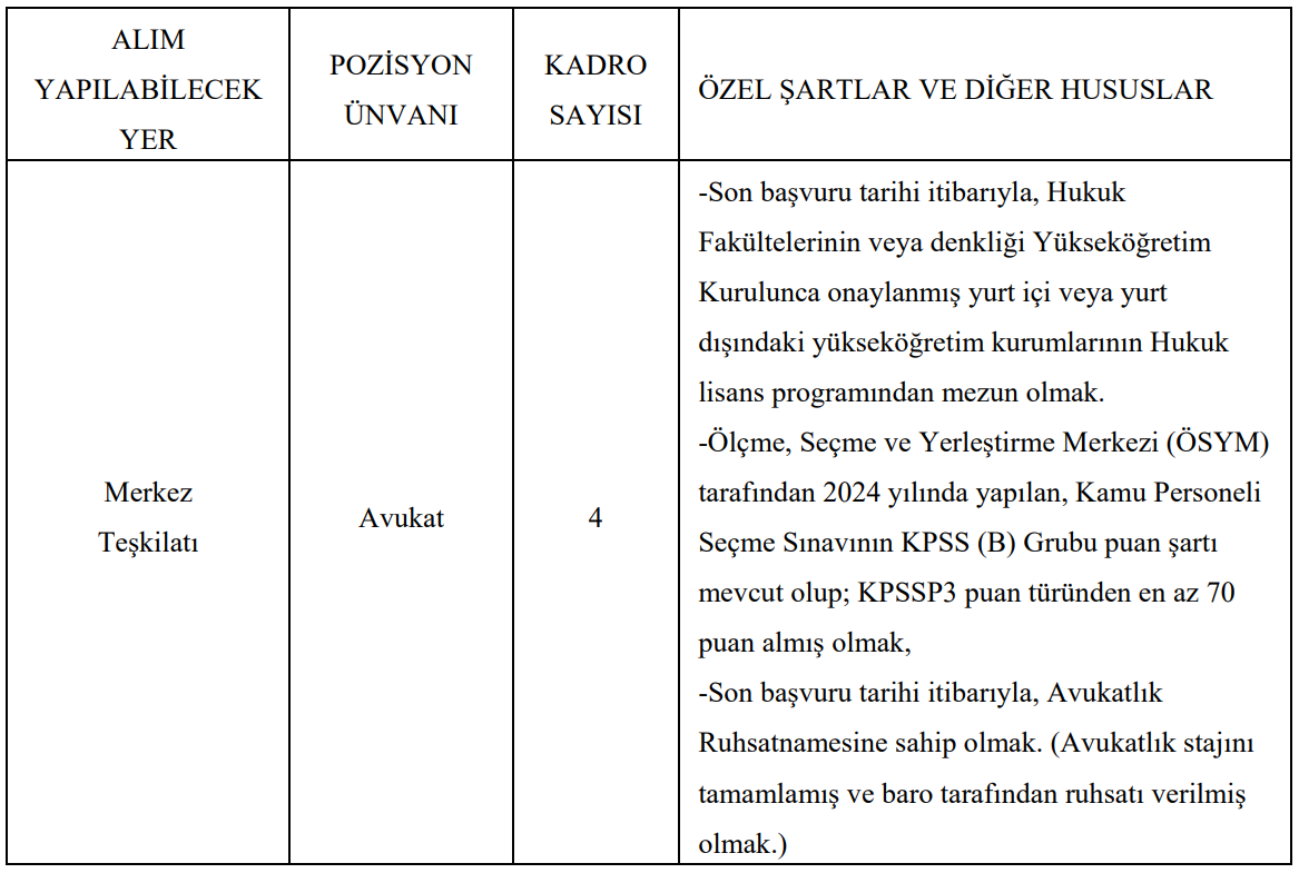 Son başvuru tarihi itibarıyla Avukatlık Ruhsatnamesine sahip olmak (stajını tamamlamış olmak şart)