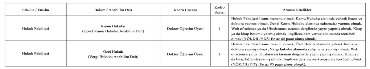 Hukuk Fakültesi bünyesinde açılan iki kadro için başvuru şartları şu şekilde açıklandı: