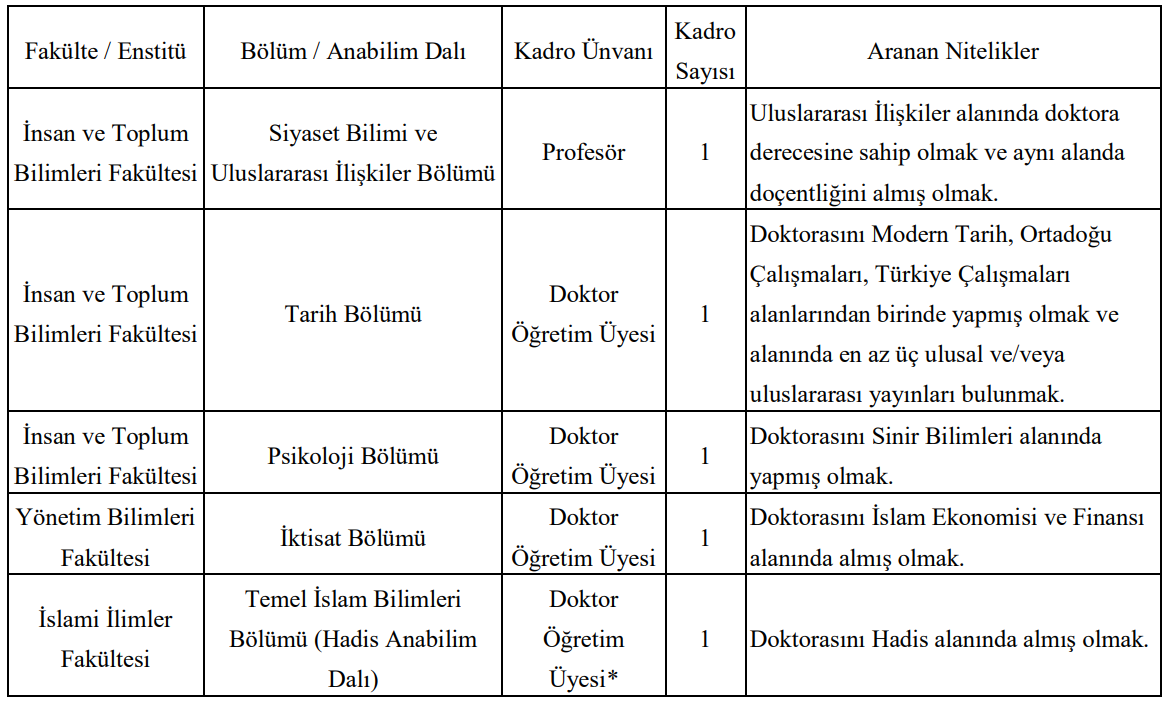 İbn Haldun Üniversitesi bünyesinde açılan öğretim üyesi kadroları ve aranan nitelikler şu şekilde: