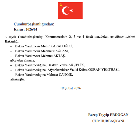 Kararda, 3 sayılı Cumhurbaşkanlığı Kararnamesi’nin 2, 3 ve 4’üncü maddeleri gereğince üç bakan yardımcısının görevden alındığı ve yerlerine üç yeni ismin atandığı bildirildi. Karar, 19 Şubat 2026 tarihinde imzalanarak yürürlüğe girdi.