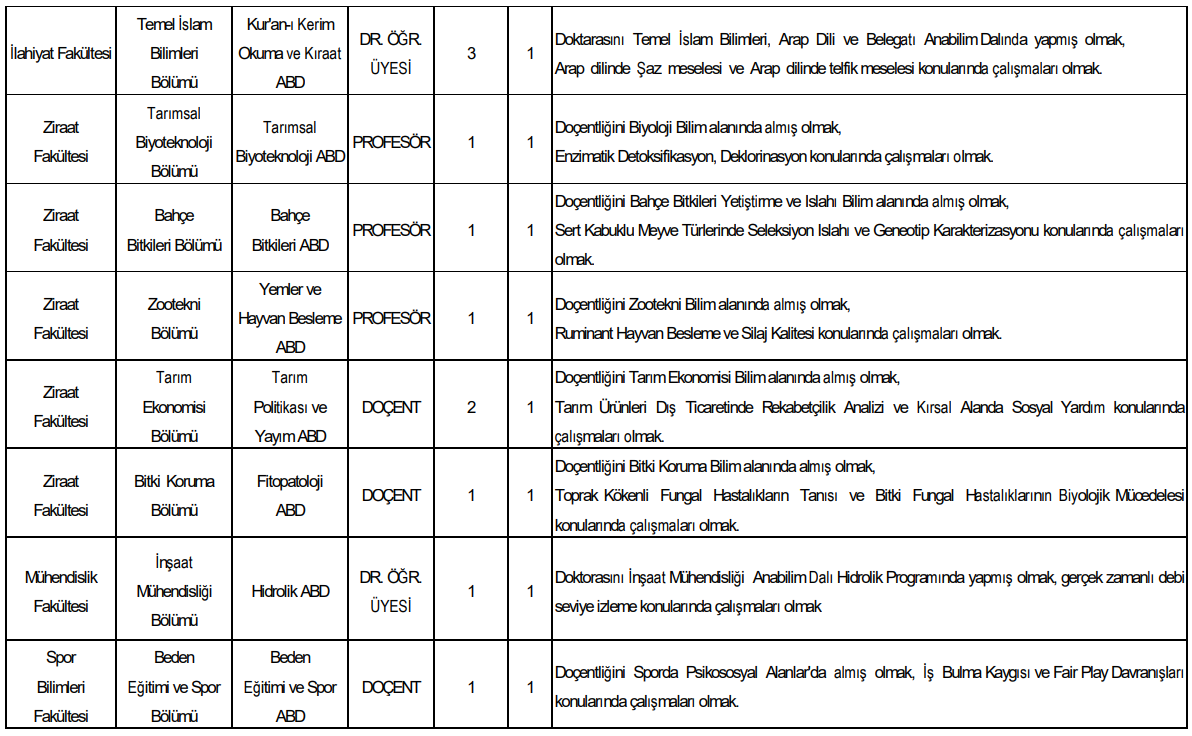 Temel İslam Bilimleri Bölümü, Kur’an-ı Kerim Okuma ve Kıraat ABD: Doktora öğretim üyesi kadrosu, Arap dili ve belagatı alanında doktora yapmış, Şaz ve telfik meselesi üzerine çalışmaları olan adaylar için.