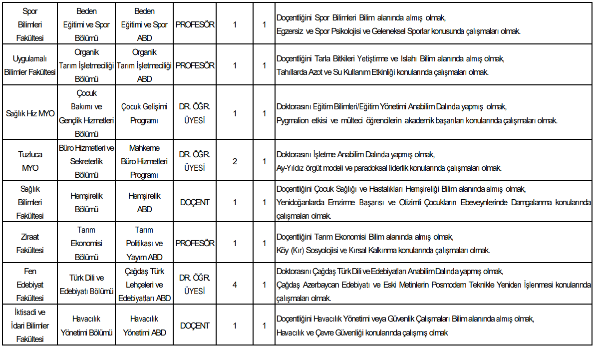 Spor Bilimleri Fakültesi: Profesör ve doçent kadroları, spor psikolojisi, egzersiz ve geleneksel sporlar konularında çalışmaları olan adaylar için.