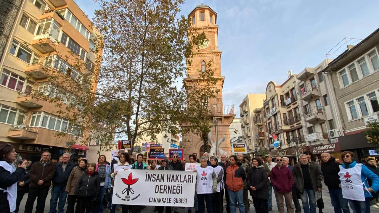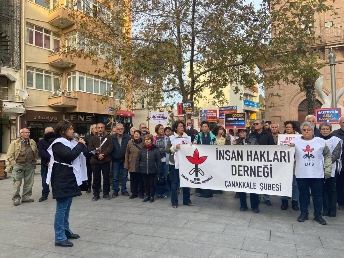 İnsan Hakları Derneği (İHD) Çanakkale Şubesi, İnsan Hakları Evrensel Bildirgesi’nin kabul edilişinin 77’nci yılı dolayısıyla Saat Kulesi önünde basın açıklaması yaptı. Açıklamayı İHD Çanakkale Şubesi Yönetim Kurulu Üyesi Canan Ar okudu.