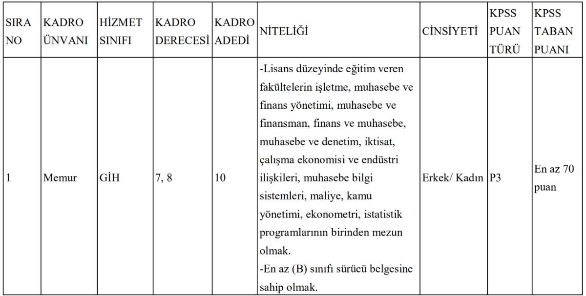 Memur kadrosuna başvuracak adayların, lisans düzeyinde eğitim veren fakültelerin belirlenen bölümlerinden mezun olmaları gerekiyor. Bu kapsamda; işletme, iktisat, maliye, kamu yönetimi, muhasebe ve finans yönetimi, muhasebe ve finansman, finans ve muhasebe, muhasebe ve denetim, çalışma ekonomisi ve endüstri ilişkileri, ekonometri, istatistik ve muhasebe bilgi sistemleri bölümleri mezunları başvuru yapabilecek.