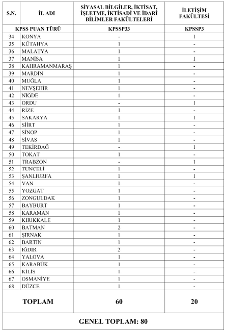 Bazı iller için birden fazla kadro ayrılırken, toplamda 60 il için 80 uzman yardımcısı istihdam edilmesi planlanıyor.