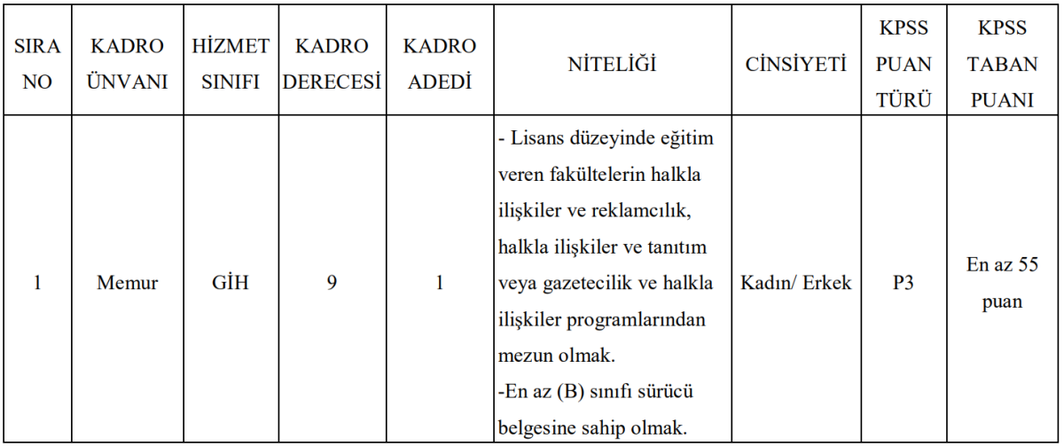 Kadın ve erkek adayların başvuru yapabildiği kadro için KPSS P3 puan türünden en az 55 puan alınmış olması gerekiyor.
