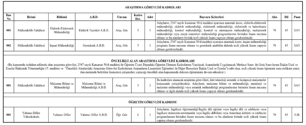 Araştırma görevlisi kadroları ağırlıklı olarak Mühendislik Fakültesi bünyesinde açılırken, öğretim görevlisi alımı Yabancı Diller Yüksekokulu için yapılacak.