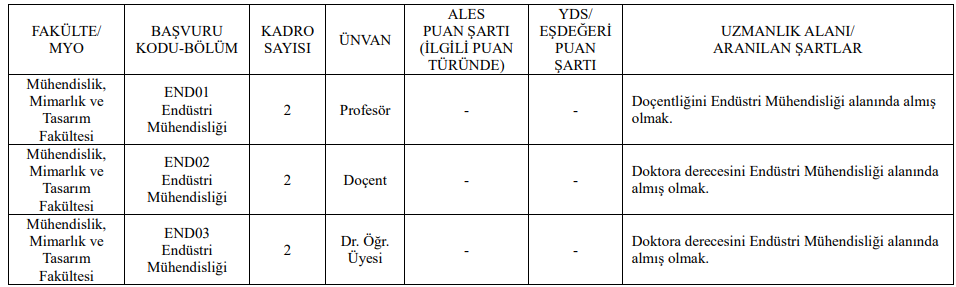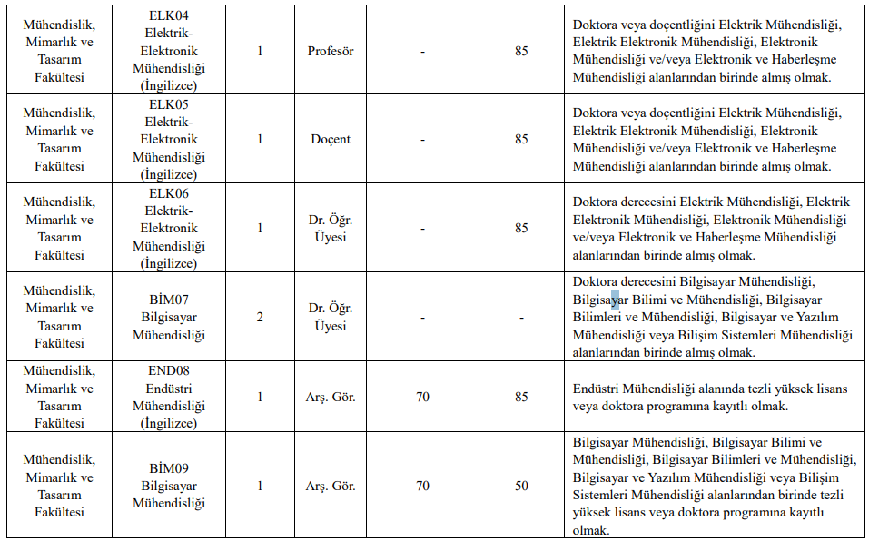 Endüstri Mühendisliği, Elektrik-Elektronik Mühendisliği (İngilizce) ve Bilgisayar Mühendisliği bölümlerinde profesör, doçent, doktor öğretim üyesi ve araştırma görevlisi kadroları açıldı.
