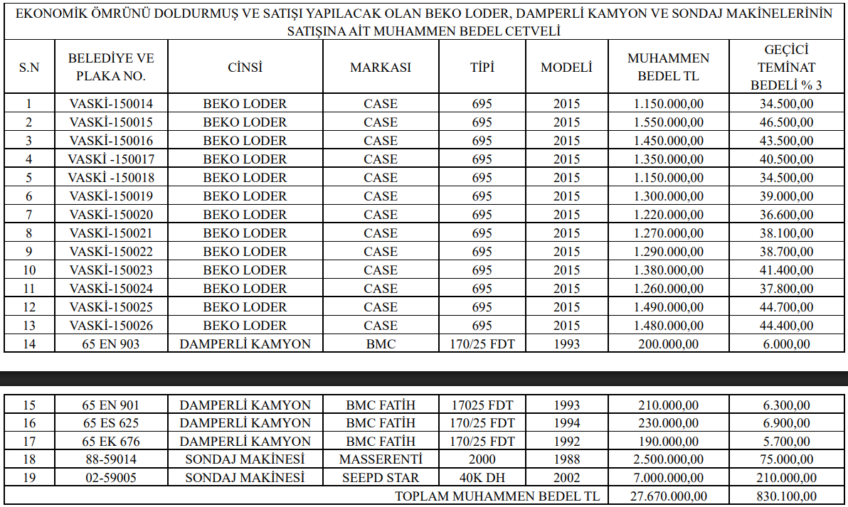 VASKİ tarafından yayımlanan muhammen bedel cetveline göre, araçların tek tek satış bedelleri belirlendi. Beko loderlerin muhammen bedelleri 1 milyon 150 bin TL ile 1 milyon 550 bin TL arasında değişirken, damperli kamyonların muhammen bedelleri 190 bin TL ile 230 bin TL arasında yer alıyor.