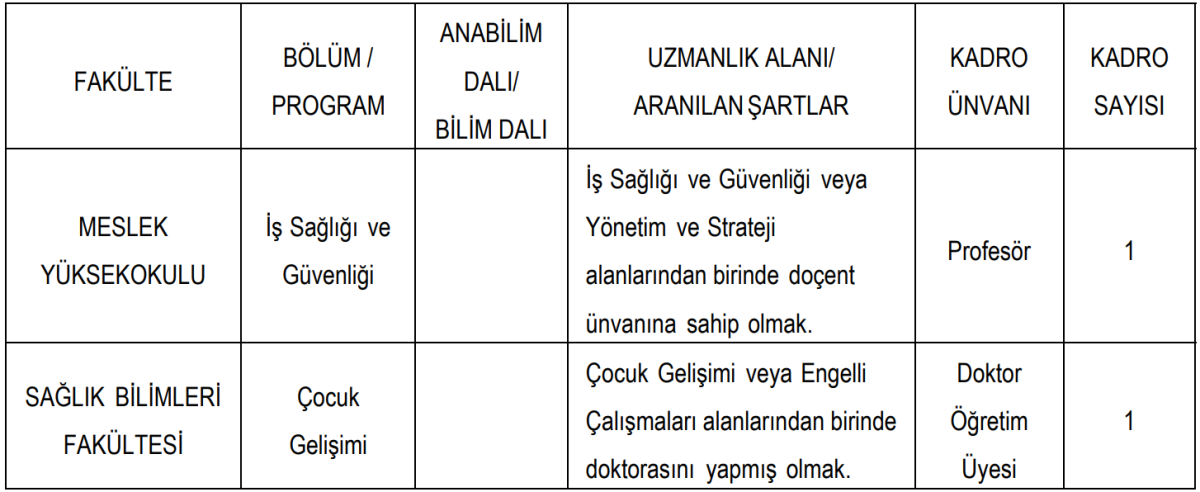 alanlarından birinde doçent unvanına sahip olmaları şartı aranıyor. Bu kadro için 1 Profesör istihdam edilecek.