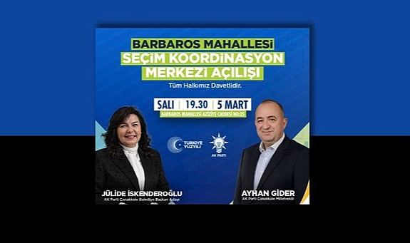 AK Parti Çanakkale Milletvekili Ayhan Gider ve AK Parti Çanakkale Belediye Başkan Adayı Jülide İskenderoğlu, bugün 19:30’da Barbaros Mahallesi Aziziye Caddesi’nde gerçekleştirilecek olan Barbaros Mahallesi seçim koordinasyon merkezi açılışına katılacaklar.