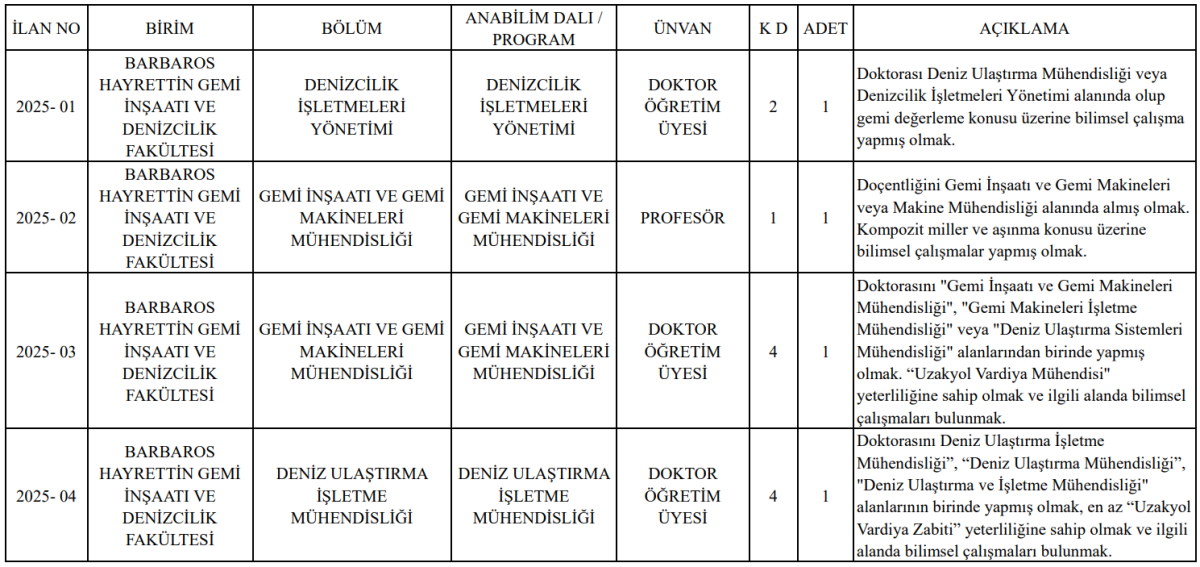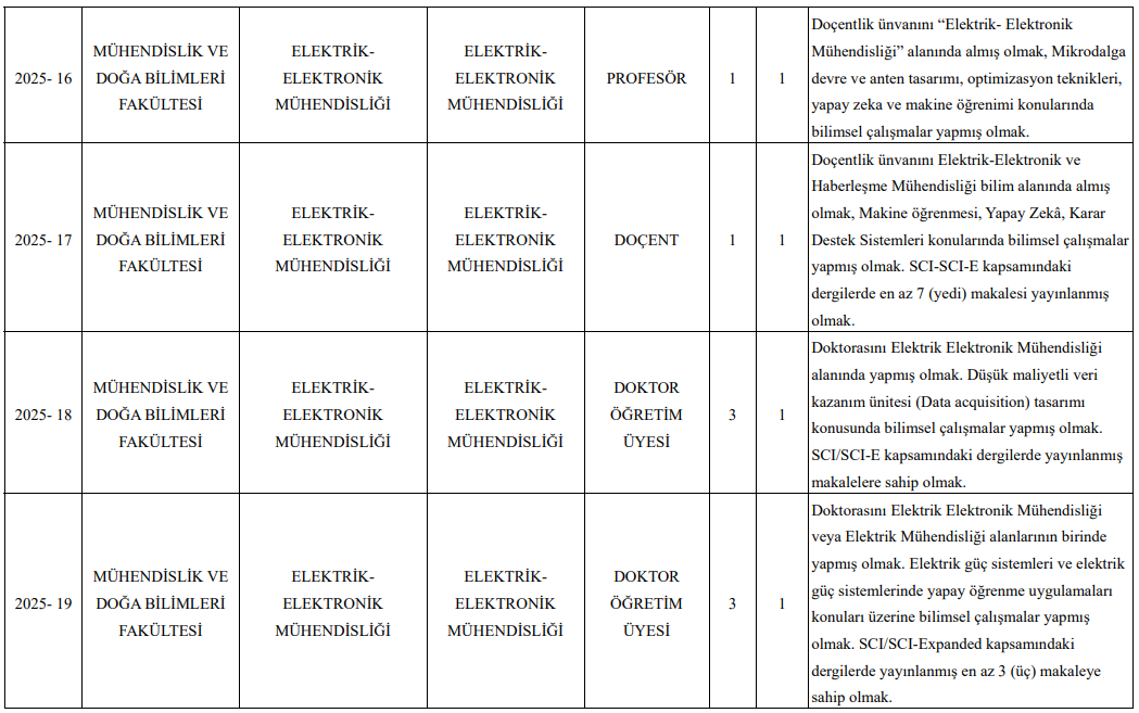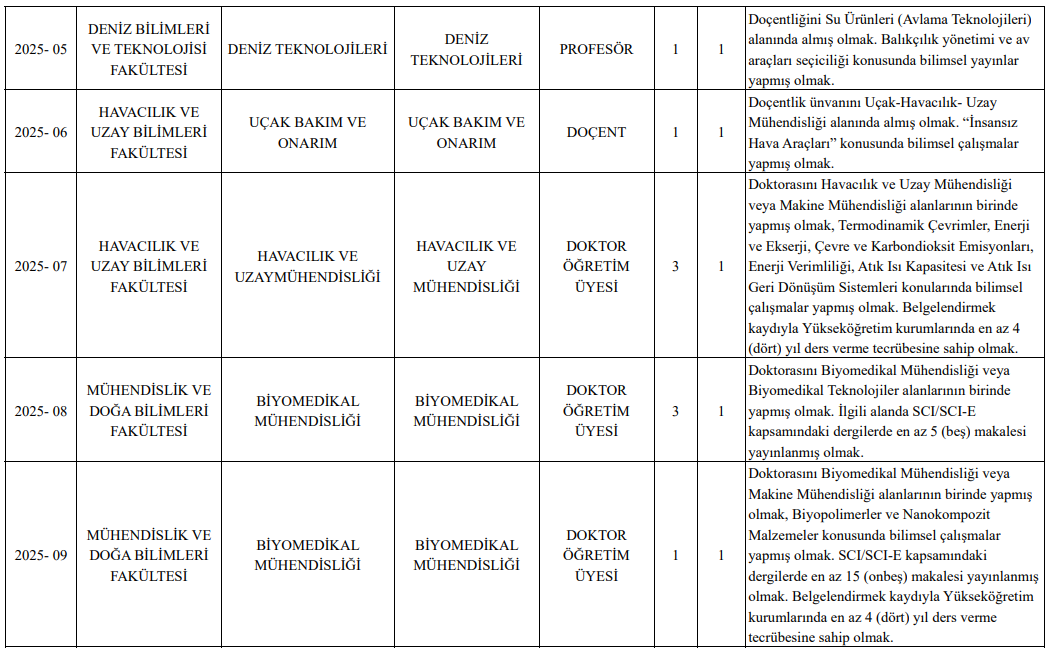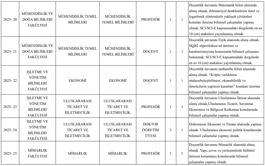 Adayların, 2547 sayılı Yükseköğretim Kanunu’nun ilgili maddeleri ile Öğretim Üyeliğine Yükseltilme ve Atanma Yönetmeliği hükümlerine uygun olmaları gerekiyor.