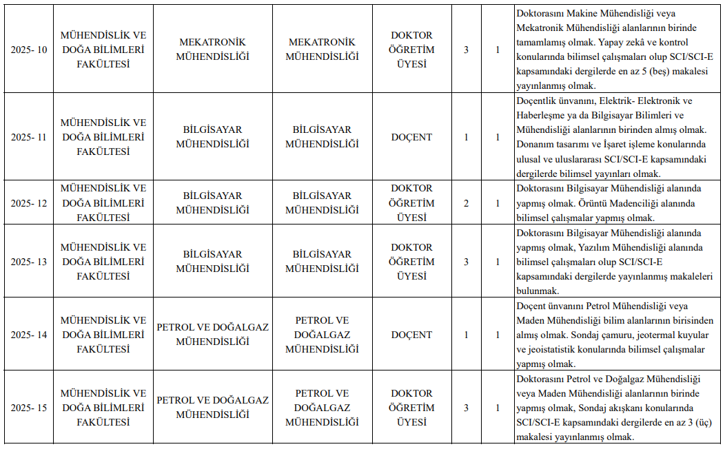 Açılan kadrolar şu fakülte ve bölümlerde yer alıyor: