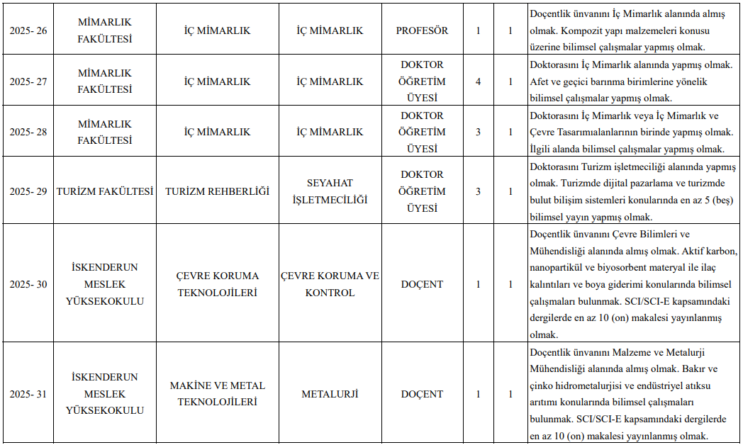 İskenderun Teknik Üniversitesi, 2025 yılı akademik kadro planlamasında çok sayıda fakülte ve bölüm için kontenjan açtı.