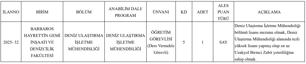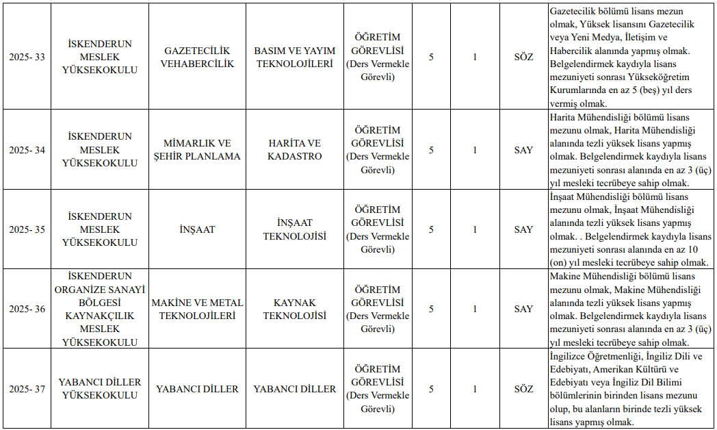 Ayrıca öğretim görevlisi kadrolarına başvuracak adayların, ALES’ten en az 70 puan ve YDS veya eşdeğeri sınavlardan en az 85 puan almış olmaları şart.