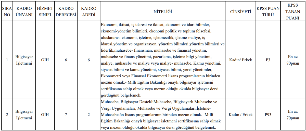Genel müdürlük bünyesinde açık olan kadrolar arasında Bilgisayar İşletmeni unvanı öne çıkıyor. Bu pozisyonlar, hem lisans hem de ön lisans mezunlarını kapsıyor ve adaylardan KPSS taban puanı, ilgili bilgisayar sertifikası ve eğitim şartlarını sağlama kriterleri aranıyor.