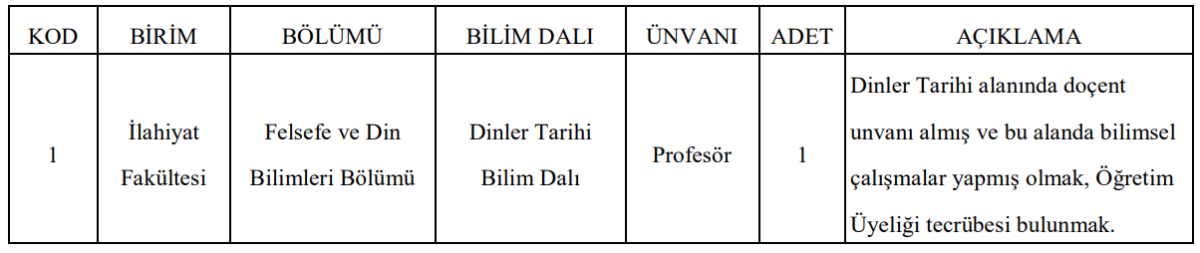 İlana göre, İstanbul 29 Mayıs Üniversitesi İlahiyat Fakültesi Felsefe ve Din Bilimleri Bölümü Dinler Tarihi Anabilim Dalı’na bir profesör alınacak. Başvuru yapacak adayların, Dinler Tarihi alanında doçent unvanı almış, bu alanda bilimsel çalışmalar yapmış ve öğretim üyeliği tecrübesine sahip olmaları gerekiyor. Üniversite, bu kadro için yalnızca bir (1) profesör alımı gerçekleştirecek.