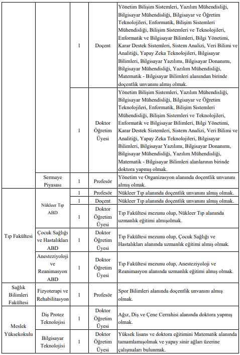 Yayımlanan ilana göre öğretim üyesi kadroları profesör, doçent ve doktor öğretim üyesi unvanlarında olacak şekilde planlandı. Hukuk Fakültesi’nde Ceza ve Ceza Muhakemesi Hukuku alanında doçent kadrosu açılırken, Mühendislik-Mimarlık Fakültesi’nde Endüstri Mühendisliği ve Makine Mühendisliği bölümleri için akademik personel alınacak.