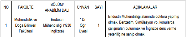 Mühendislik: Endüstri ile Elektrik-Elektronik Mühendisliği bölümlerine robotik, otomasyon ve benzetim konularında uzman Doçent ve Dr. Öğretim Üyeleri alınacak.