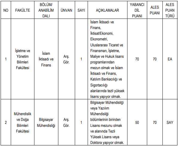 İslam İktisadı ve Finans: EA puan türünde en az 70 ALES ve 70 Yabancı Dil puanı şartı.