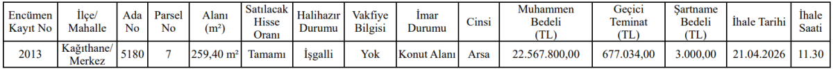 Toplam 259,40 m² büyüklüğündeki arsa, tamamı satılacak şekilde ihaleye sunulacak. Taşınmazın mevcut durumunun “işgalli” olduğu belirtilirken, imar planında konut alanı olarak yer aldığı açıklandı.