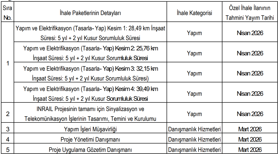 Projenin tamamı için sinyalizasyon ve telekomünikasyon sistemlerinin tasarımı, temini ve kurulumu ayrı bir ihale paketi olarak duyuruldu. Bu paket de açık uluslararası rekabetçi ihale yöntemiyle gerçekleştirilecek ve ilanının Nisan 2026’da yayımlanması öngörülüyor.