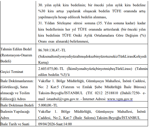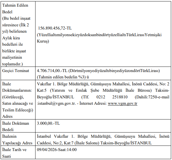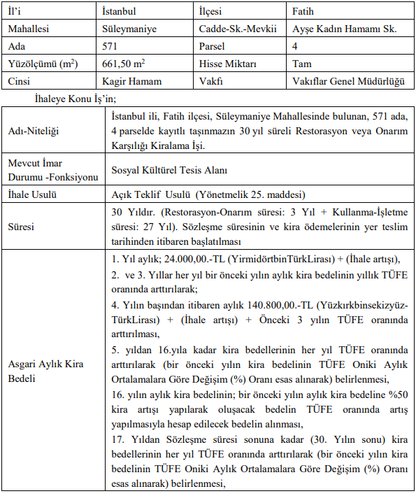 Tüm ihaleler İstanbul Vakıflar 1. Bölge Müdürlüğü’nde gerçekleştirilecek.