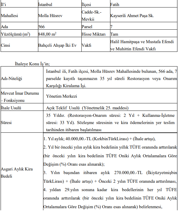 Fatih ve Arnavutköy’de bulunan üç ayrı taşınmaz için düzenlenecek ihalelerde süreler 30 ila 35 yıl arasında değişiyor.