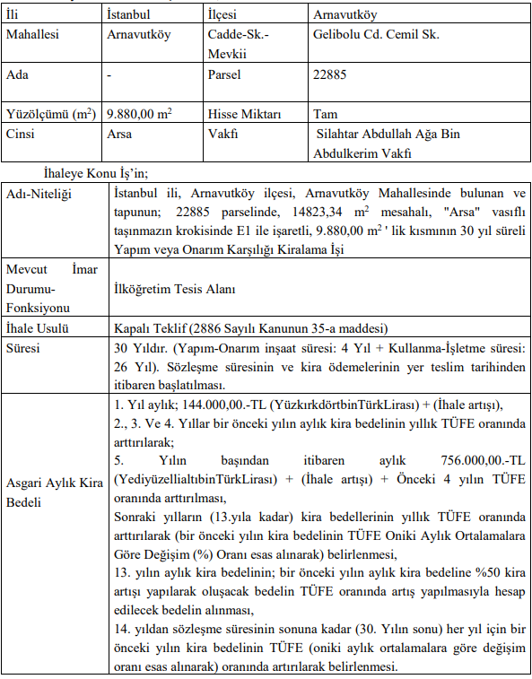 Arnavutköy’de yer alan yaklaşık 9.880 m² büyüklüğündeki arsa için de yapım karşılığı kiralama ihalesi yapılacak.