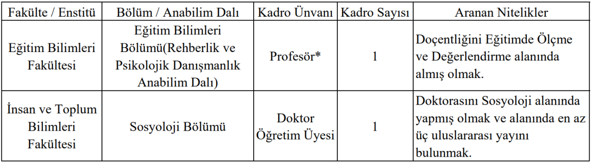 İnsan ve Toplum Bilimleri Fakültesi Sosyoloji Bölümü için açılan 1 Doktor Öğretim Üyesi kadrosuna başvuracak adayların,