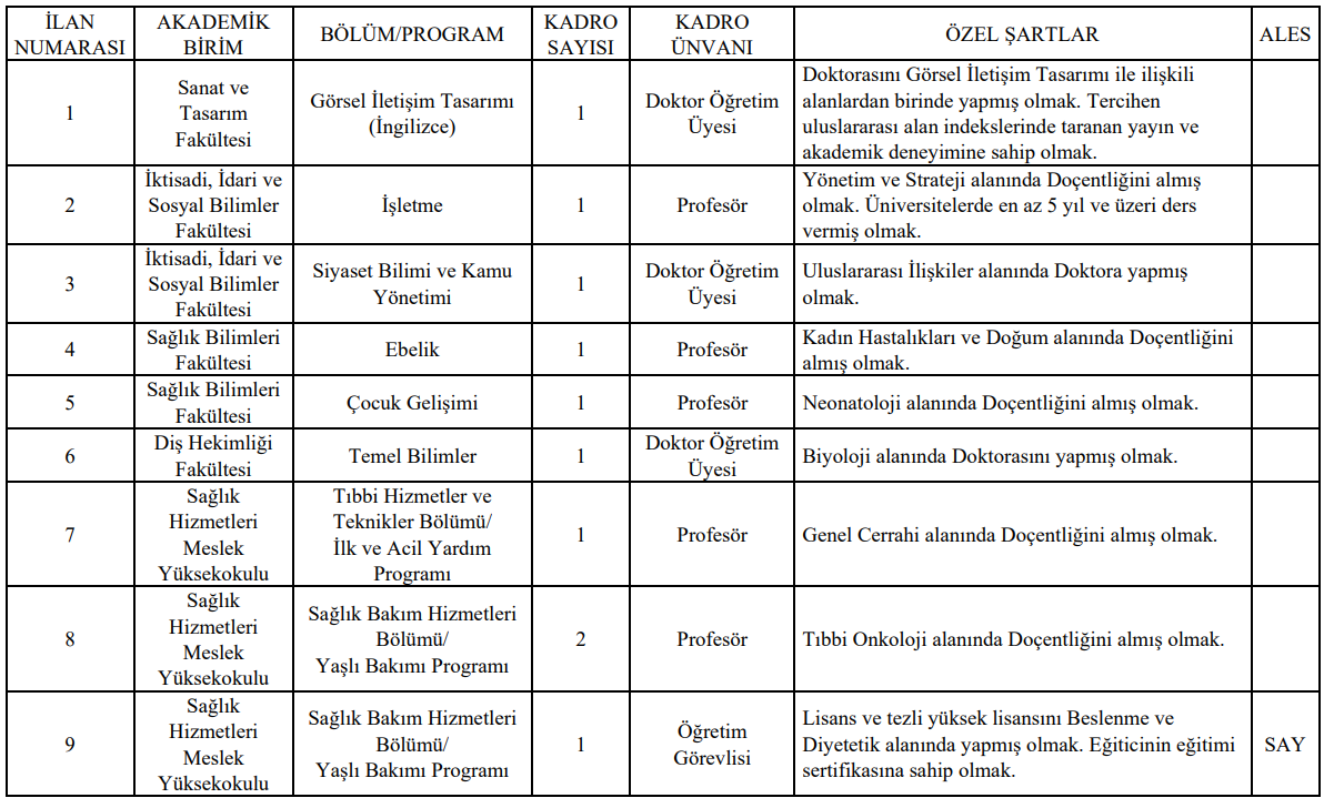 İlan detaylarına göre Sanat ve Tasarım Fakültesi Görsel İletişim Tasarımı (İngilizce) bölümüne 1 doktor öğretim üyesi alınacak. İktisadi, İdari ve Sosyal Bilimler Fakültesi İşletme bölümüne 1 profesör, Siyaset Bilimi ve Kamu Yönetimi bölümüne ise 1 doktor öğretim üyesi kadrosu açıldı. Sağlık Bilimleri Fakültesi’nde Ebelik ve Çocuk Gelişimi bölümleri için profesör alımı yapılacak.