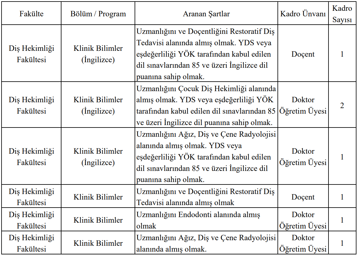Yayımlanan ilana göre İstanbul Galata Üniversitesi özellikle Diş Hekimliği Fakültesi Klinik Bilimler bölümü için farklı alanlarda akademik personel alımı yapacak. Restoratif Diş Tedavisi, Çocuk Diş Hekimliği, Ağız Diş ve Çene Radyolojisi ile Endodonti alanlarında doçent ve doktor öğretim üyesi kadroları açıldı.