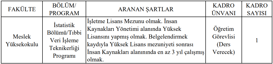 Üniversitenin Meslek Yüksekokulu bünyesinde yer alan İstatistik Bölümü Tıbbi Veri İşleme Teknikerliği Programı için bir öğretim görevlisi kadrosu açıldı. Bu kadroya başvuracak adayların işletme lisans mezunu olması, İnsan Kaynakları Yönetimi alanında yüksek lisans yapmış bulunması ve yüksek lisans sonrasında en az üç yıl insan kaynakları alanında çalıştığını belgelemesi gerekiyor.