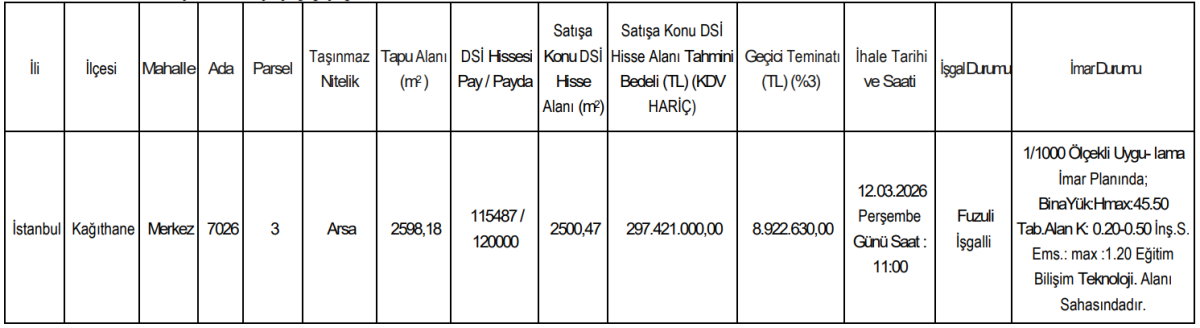 Devlet Su İşleri Genel Müdürlüğü 14. Bölge Müdürlüğü, İstanbul Kağıthane’de bulunan hisseli bir arsayı kapalı teklif (artırma) usulüyle satışa çıkarıyor. 2886 sayılı Devlet İhale Kanunu’nun 35/a maddesi kapsamında gerçekleştirilecek ihale, 12 Mart 2026 Perşembe günü saat 11.00’de İstanbul Küçük Çamlıca’daki Bölge Müdürlüğü binasında yapılacak.