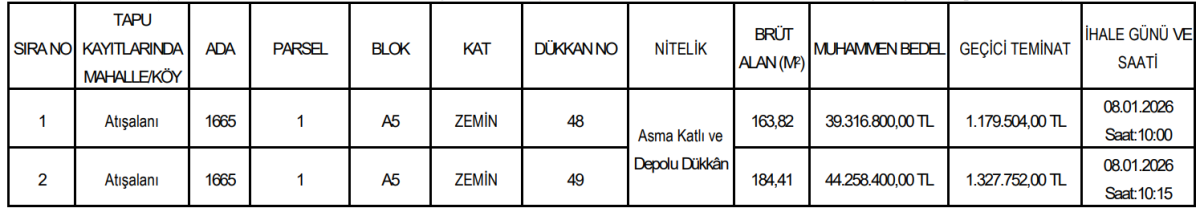 İlk taşınmaz; 1665 ada, 1 parsel, A5 blok, zemin kat 48 numaralı dükkân olarak tapu kayıtlarında yer alıyor. 163,82 metrekare brüt alana sahip olan bu taşınmaz için belirlenen muhammen bedel 39 milyon 316 bin 800 TL olarak açıklandı. Geçici teminat bedeli ise 1 milyon 179 bin 504 TL olarak belirlendi. Bu dükkânın ihalesi 8 Ocak 2026 Perşembe günü saat 10.00’da yapılacak.