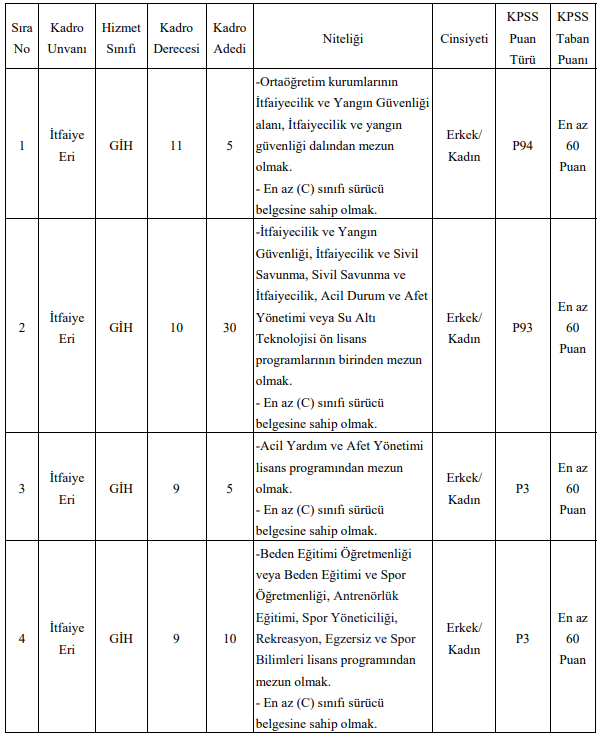 Duyuruda yer alan bilgilere göre toplam 50 kişilik itfaiye eri kadrosu dört farklı eğitim düzeyine ayrıldı. Ortaöğretim mezunları için 5 kişilik kontenjan ayrılırken, ön lisans mezunları için 30 kişilik geniş bir kadro planlandı. Lisans mezunları arasında ise Acil Yardım ve Afet Yönetimi bölümü mezunları için 5 kişilik kontenjan bulunuyor. Spor bilimleri ve beden eğitimi alanlarından mezun adaylar için ise 10 kişilik ayrı bir kadro oluşturuldu.